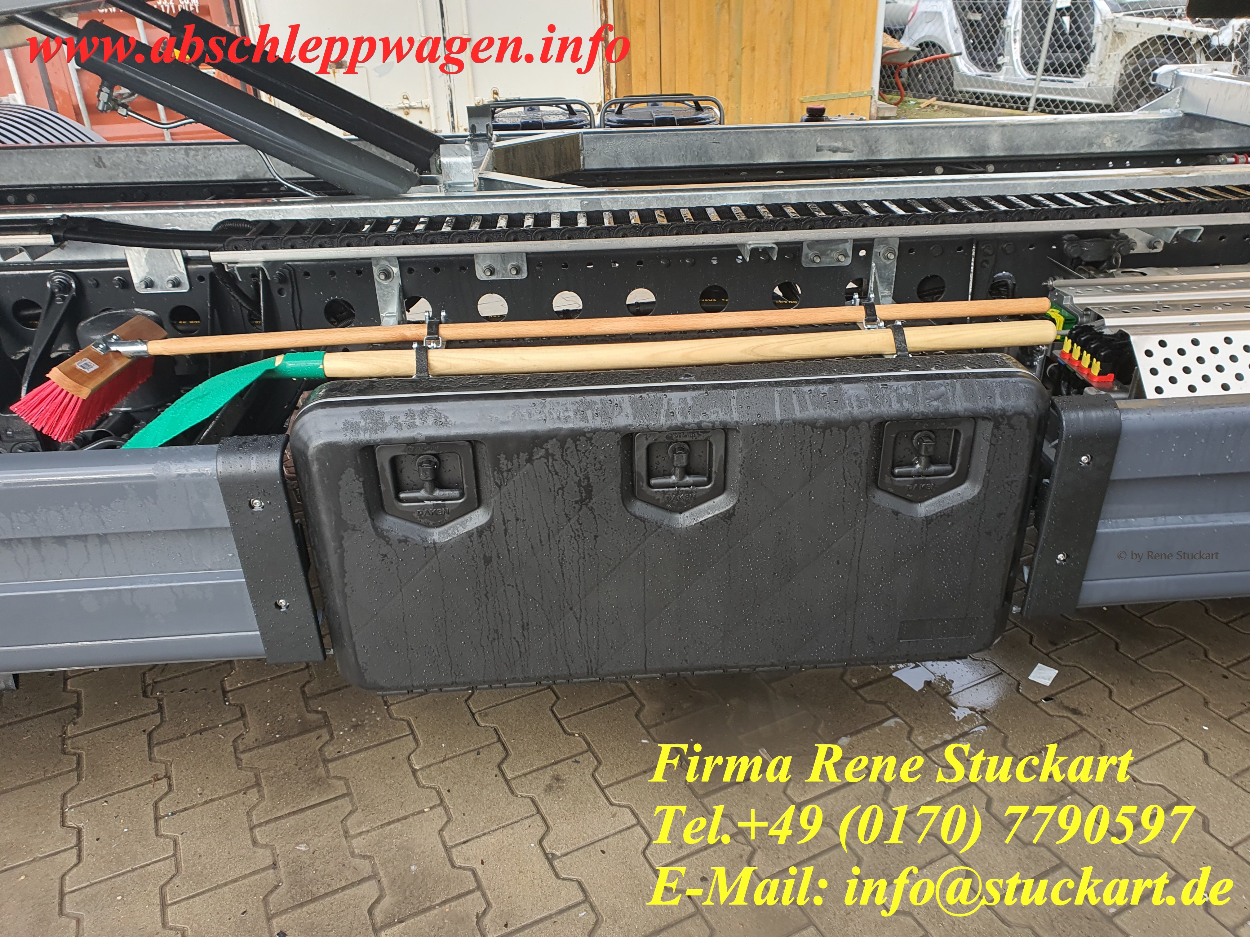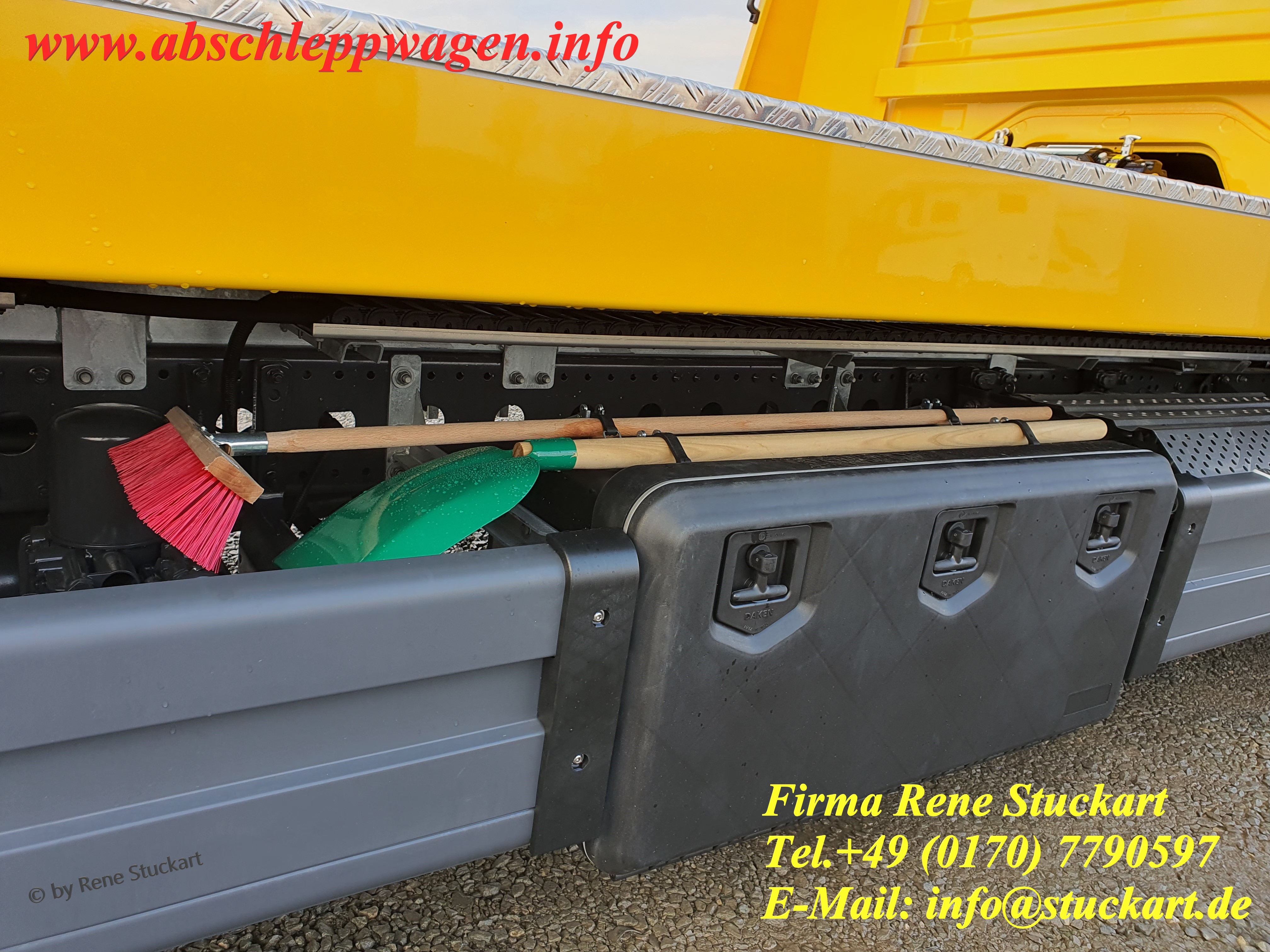 | Zusatz-Ausrüstung Plateau / Special equipment plateau : | Werkzeugkiste zusätzlich Schaufel und Besen Halterungen 2 Stück Mülleimer mit ausziehbaren Halterungen | |